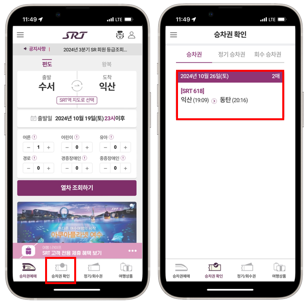 먼저 SRT 앱을 실행해 예매했던 승차권을 확인합니다.