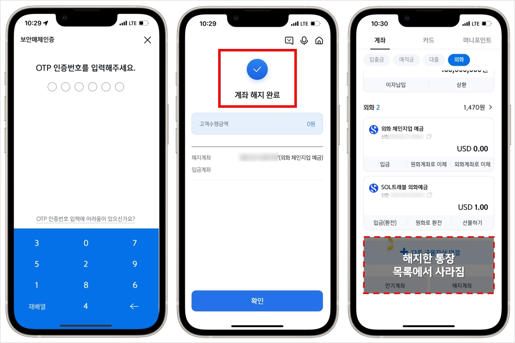 마지막으로 OTP 인증번호 6자리를 입력하면 최종적으로 계좌 해지가 완료됩니다.
