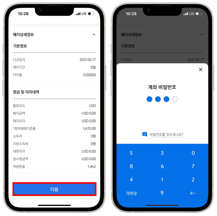 그리고 [다음] 버튼을 누르고 계좌 비밀번호 네자리를 입력합니다.