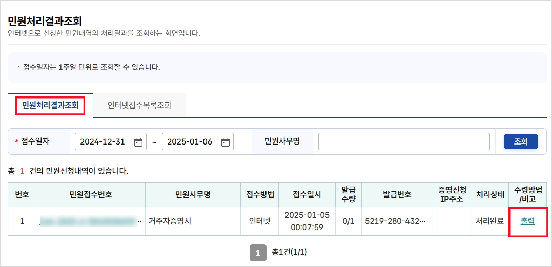 민원처리결과조회 탭으로 이동하게 되는데, 여기서 목록중 맨 우측에 '출력' 버튼이 보일겁니다.