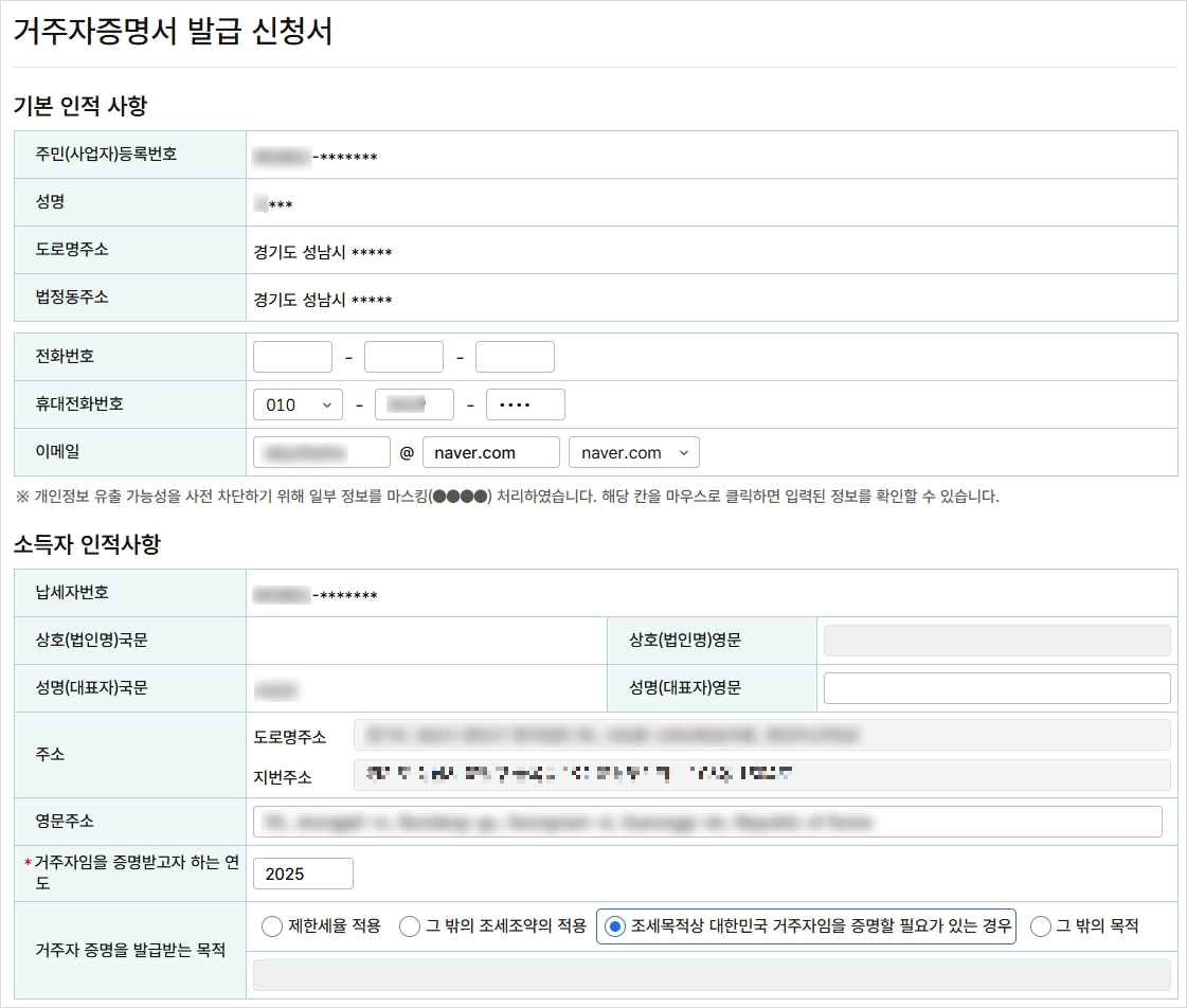 그러면 거주자증명서 발급을 위한 신청서를 작성하게 되는데, 여기에 기본적인 정보들을 입력합니다.