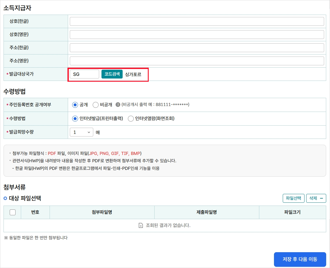 발급대상국가는 자신이 대한민국 거주자임을 증명할 대상 국가에 대한 정보를 입력합니다.