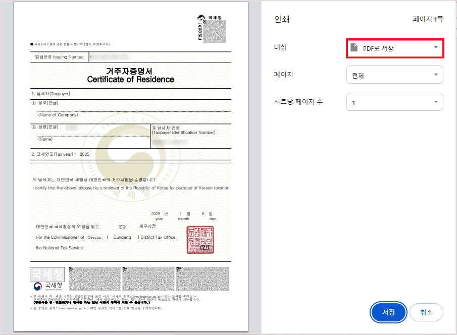 저는 구글 애드센스에 제출할 자료이니 파일 형태가 편해서 PDF로 발급받았습니다.