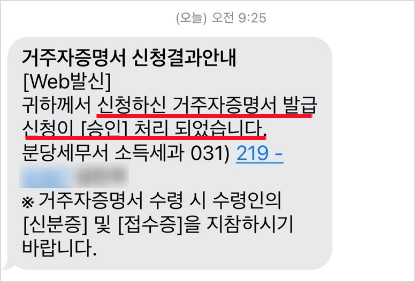 저의 경우 주말에 신청했기 때문에 하루 이상이 걸렸는데, 월요일 오전이 되니 아래와 같이 신청결과에 대해 문자로 안내받을 수 있었습니다. 다행히 정상적으로 발급이 완료되었다는 안내였습니다.