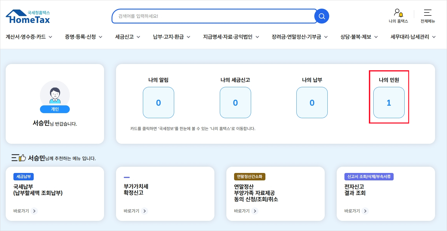 메인 화면에서 나의 민원 항목에 숫자가 1 카운트 된 것을 확인할 수 있습니다.