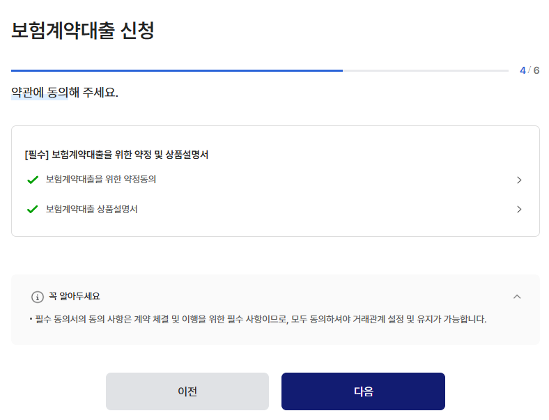 필수사항에 대해 하나라도 동의하지 않으면 대출이 불가한점 유의해주세요.