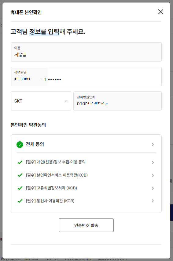 마지막으로 휴대폰 본인확인을 진행해줍니다.