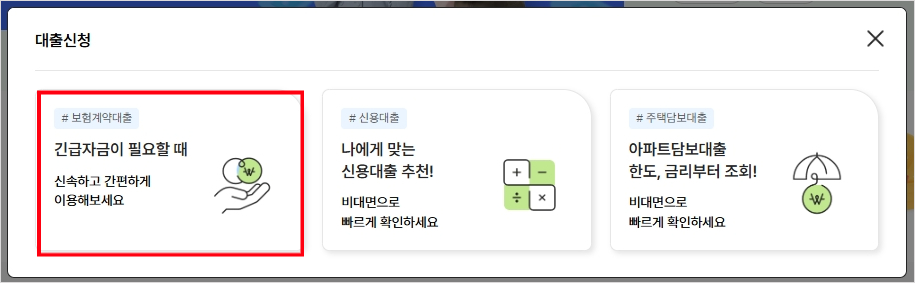 총 3가지 메뉴가 보이는데, 우리가 하려고 하는 것은 보험계약대출을 클릭합니다.