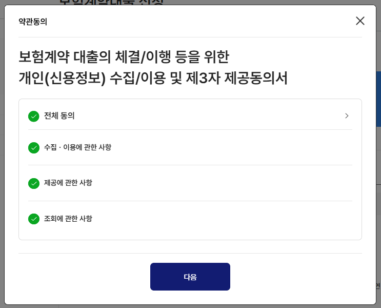 내용을 모두 체크하시고 전체동의를 한 후 [다음] 버튼을 클릭합니다.