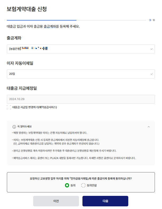 이제 이자가 출금될 계좌와 자동이체일 등을 지정하고 하단에 [다음] 버튼을 한번 클릭합니다.
