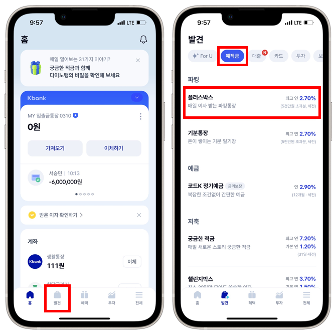 '발견' 화면 상단에 예적금 탭이 있고, 이걸 선택하면 최상단에 파킹 > 플러스박스 메뉴가 보입니다.