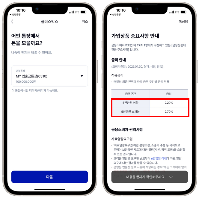 플러스박스는 5천만원 이하인 경우 2.2%를 적용하고, 초과분은 2.7%를 적용합니다. 저는 1억원을 예치할 것이기 때문에 반반씩 적용이 되어 평균적으로 2.45%의 금리가 적용이 되겠네요.