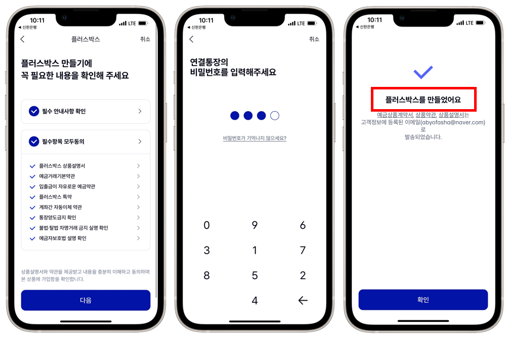 절차는 매우 간단한데, 제일 먼저 약관 동의 등을 진행하고, 연결통장의 비밀번호를 입력하면 플러스박스 만들기가 끝이 납니다.