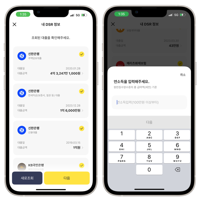 자, 이제 연소득 입력까지 끝나고 다음으로 진행하면 자동으로 금융사 정보를 조회해 DSR을 계산해줍니다.