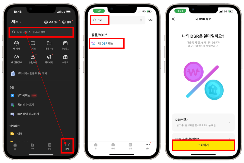 앱 하단 메뉴 탭에서 '전체'를 선택하고 상단 검색창에 'DSR' 이라고 검색하면 아래 상품/서비스 컬렉션에서 "내 DSR 정보" 라는 결과가 나옵니다. 이걸 눌러줍니다.
