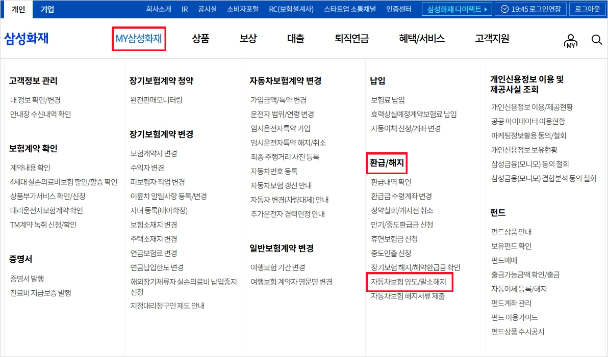 그러면 여러가지 메뉴가 나오게 되는데요. 아래 화면과 같이 '환급/해지 >자동차보험 양도/말소해지' 메뉴를 클릭합니다.