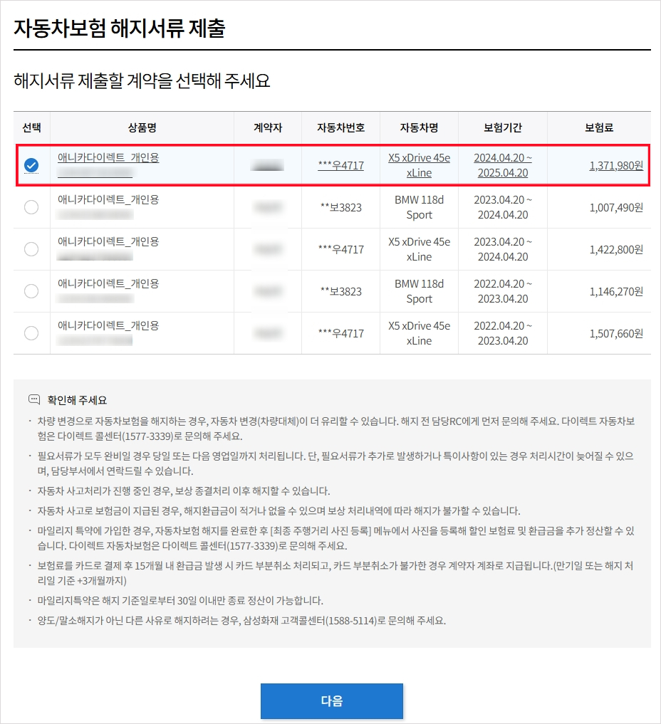 아래 화면처럼 해지할 보험을 선택하여 체크하고, 하단에 [다음] 버튼을 클릭해 진행합니다.