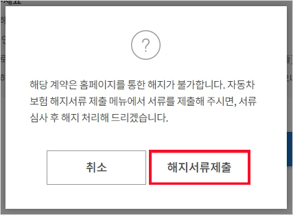 해지서류만 제출하면 인터넷으로 진행 가능하니 포기하지 마시고 팝업에서 '해지서류제출' 버튼을 클릭합니다.