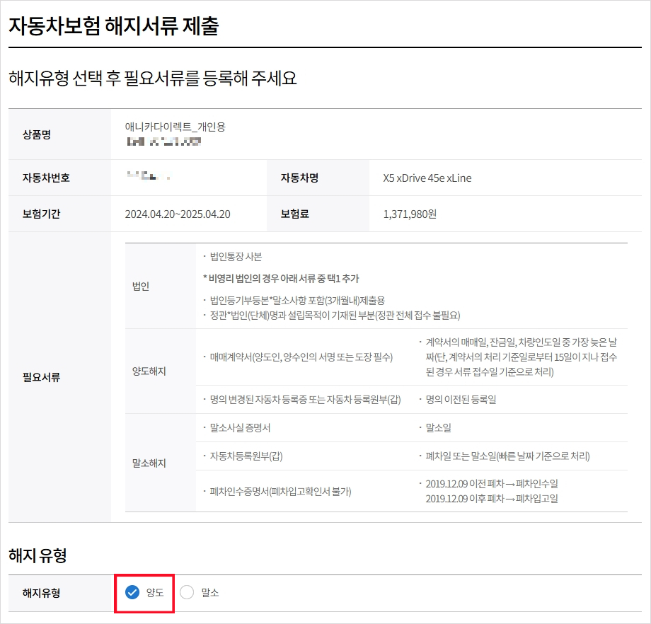 저의 경우 4월 기준으로 매년 갱신을 해왔습니다. 그런데 자동차를 팔은 시점이 2월이니, 약 2개월간의 보험료를 환급받을 필요가 있던 것이죠. 이 자동차보험을 하루라도 늦게 해지하면 그 일수만큼 환급액이 줄어들 수 있으니 가급적 팔자마자 바로 보험을 해지하는 것이 좋습니다.
