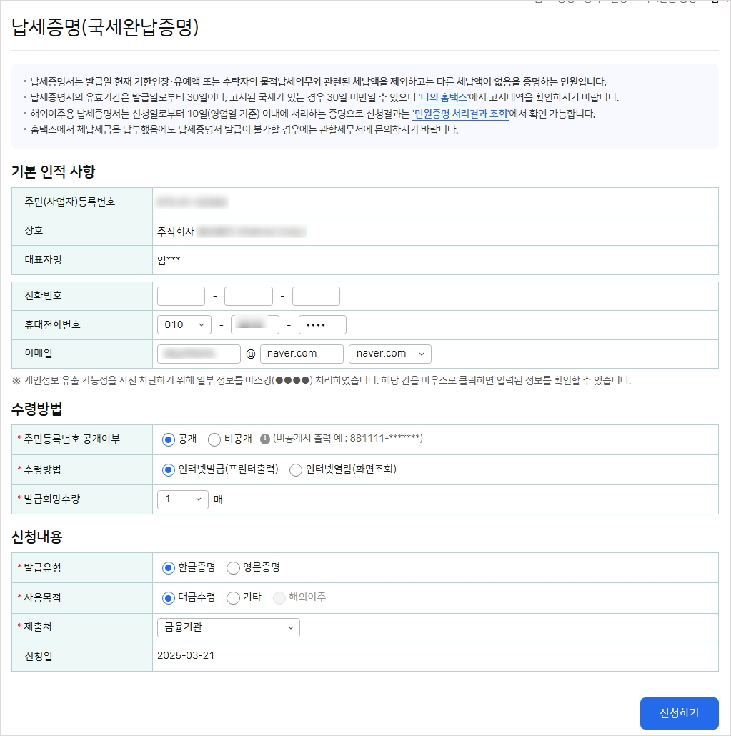 납세증명서 발급 화면으로 들어오면 로그인한 법인사업자를 기반으로 기본 인적사항이 자동으로 노출됩니다.