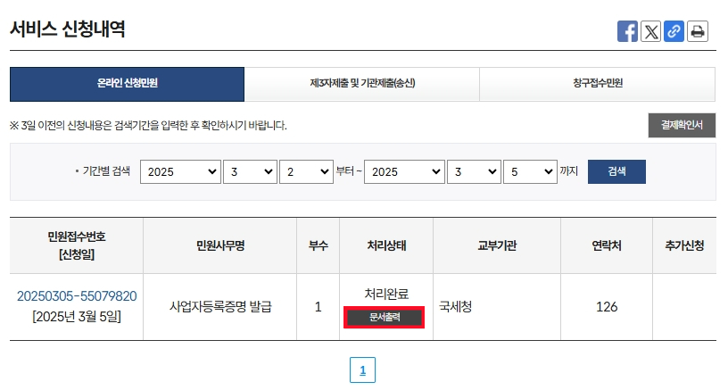 이 목록에서 [문서출력]을 선택하면 바로 사업자등록증명을 발급받을 수 있습니다.