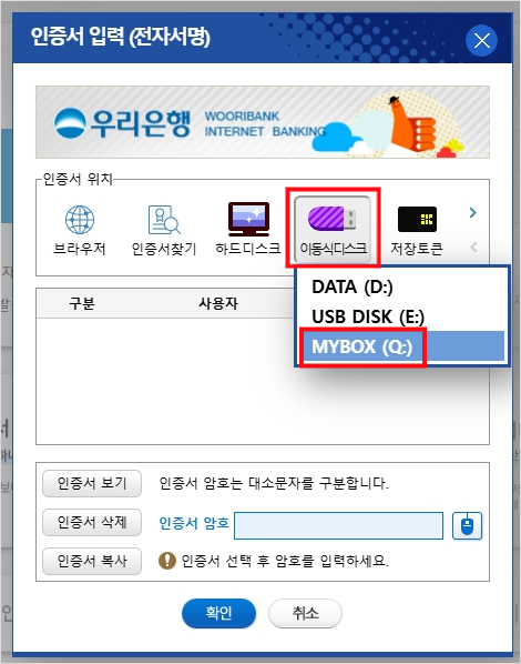 아래 화면처럼 공동인증서 팝업에서 이동식디스크를 선택해주고 하단에 MYBOX 드라이브를 선택해줍니다.
