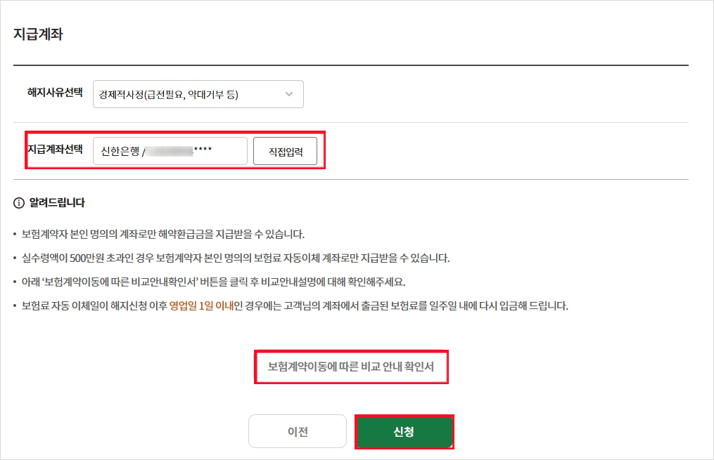 이후 '보험계약이동에 따른 비교 안내 확인서'를 확인하고 맨 하단에 [신청] 버튼을 클릭하면 됩니다.