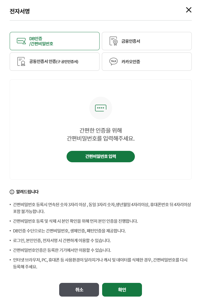 전자서명 수단에는 DB인증/간편비밀번호, 금융인증서, 공동인증서, 간편인증(카카오인증) 등을 제공합니다. 원하시는 방식을 선택해 전자서명을 완료하면 최종적으로 해지가 됩니다.