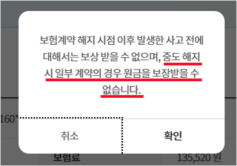 이 때 얼럿이 하나 뜨게 되는데, 보험 중도 해지시 원금을 보장받을 수 없다는 안내가 나옵니다.