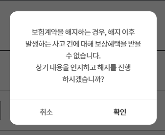 아래와 같은 얼럿을 통해 보험계약 해지 후 발생하는 사건/사고에 대해서는 보상혜택을 받을 수 없다는 안내를 확인합니다.