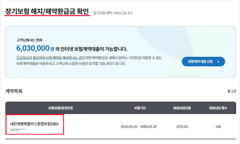 오래 유지한 보험을 아깝게 해지하는 것보다는 잠깐 돈을 융통하기 위함이 목적이라면 계약대출을 알아보는 것도 좋습니다. 하지만 저는 오늘 해지를 마음 먹었기 때문에 살포시 무시해봅니다.