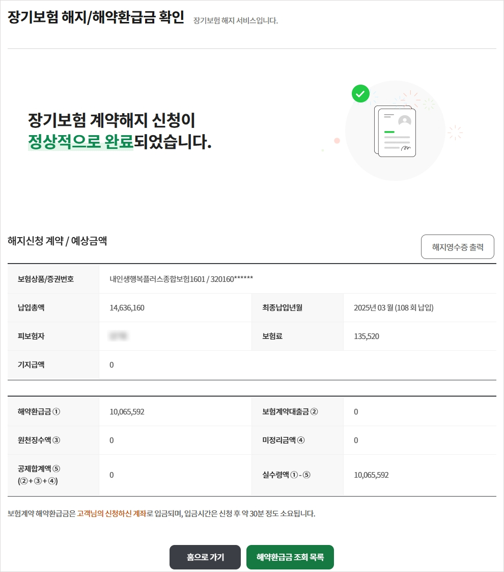 아래와 같이 장기보험 계약해지 신청이 정상적으로 완료되었다는 화면을 확인할 수 있습니다.