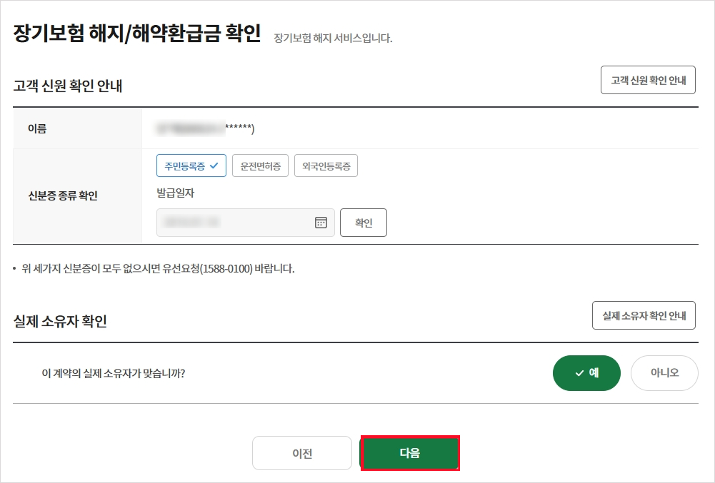 그렇게 해지할 보험을 선택하면 신원확인 절차로 들어갑니다.