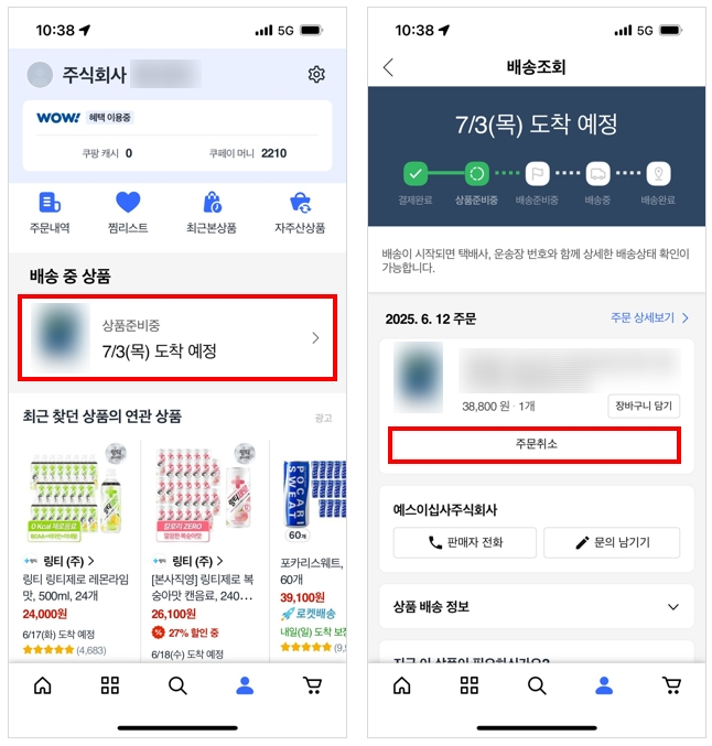 쿠팡 앱으로 주문한 물건 취소하는 방법