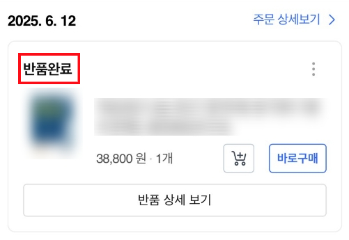 그렇기 때문에 얼마후 다시 주문 내역을 확인하면 '반품 접수' 였던 상태가 '반품 완료' 상태로 변경된 것을 확인할 수 있습니다.