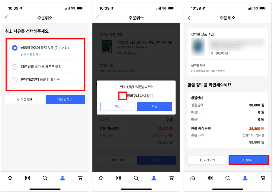 그리고 [확인] 버튼을 누르면 다음 화면에서 주문 취소를 위한 환불정보를 확인하게 됩니다. 여기서 별다른 문제가 없다면 아래에 [신청하기] 버튼을 눌러 주문 취소를 신청합니다.