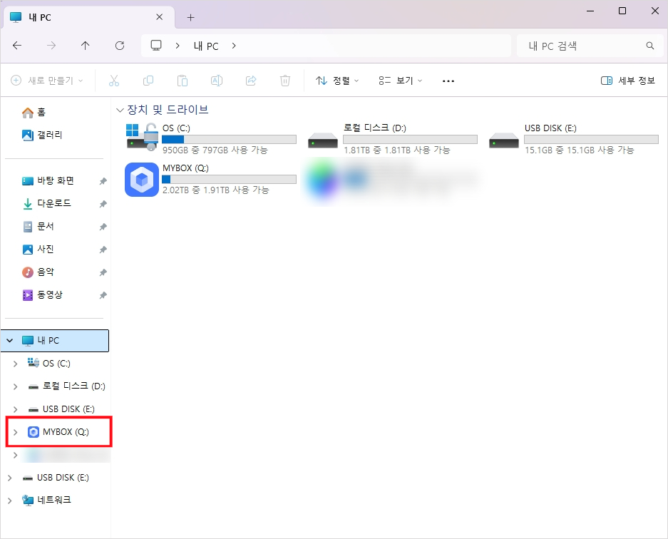 아래 화면처럼 내PC 폴더를 열면 좌측에 MYBOX가 설정된 드라이브가 보일 것입니다.