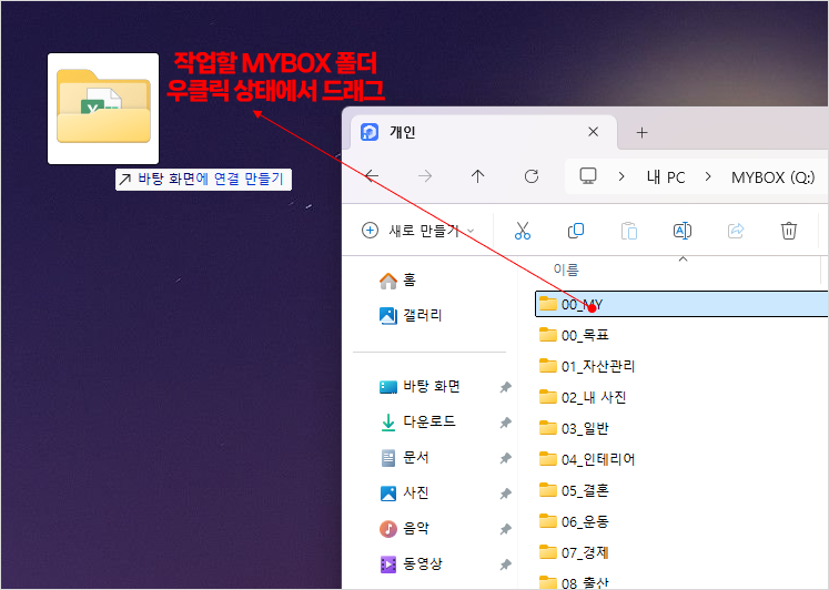 MYBOX 프로그램을 실행하고 로그인 한 상태에서 MYBOX가 설정된 드라이브를 바로가기 설정하는 것입니다.