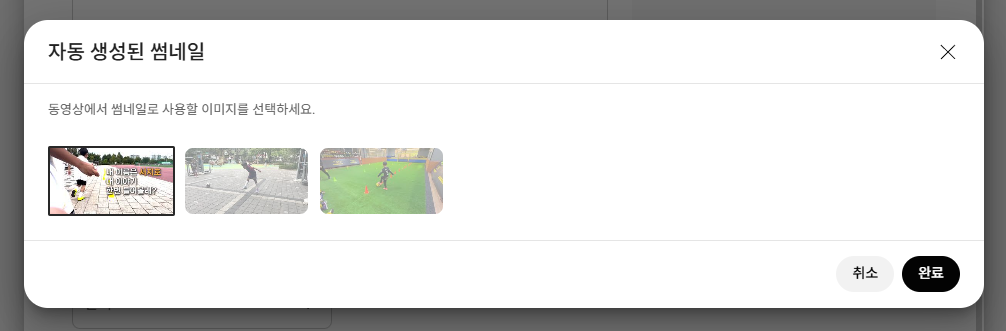 썸네일은 편의를 위해 자동으로 썸네일을 추천해주는데, 첫 장면을 선택할 수도 있고 마음에 드는 장면을 선택할 수도 있습니다.
