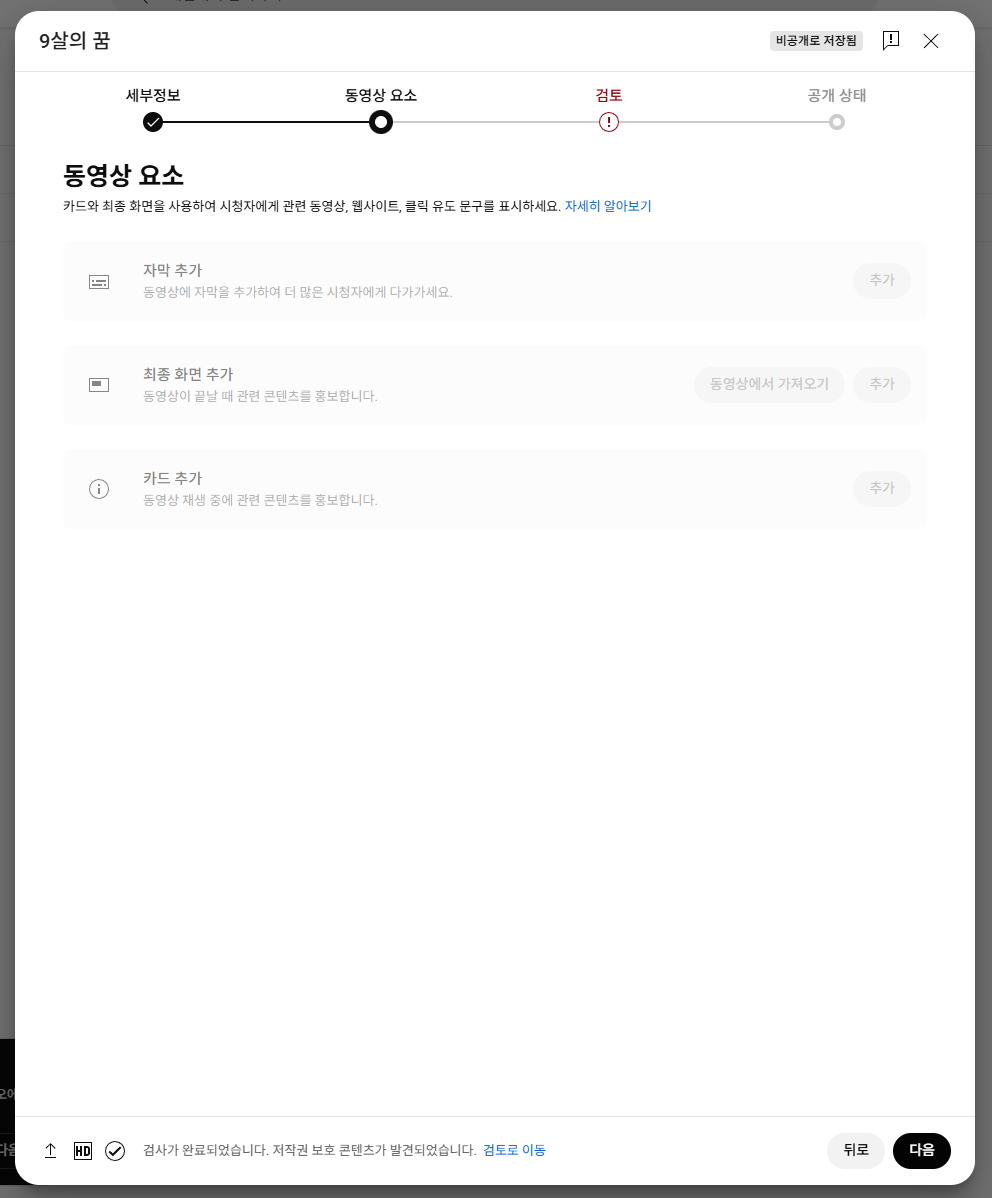 사람들에게 나의 동영상을 어필할만한 요소로 자막, 최종화면, 카드 등을 추가할 수 있습니다. 저는 여기서 딱히 할게 없어 그냥 넘어갔습니다.