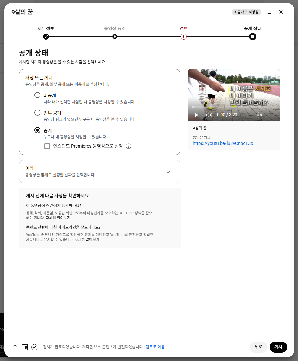저는 이 영상으로 수익을 낼 생각은 없기 때문에 일단 동영상을 공개로 설정했습니다.