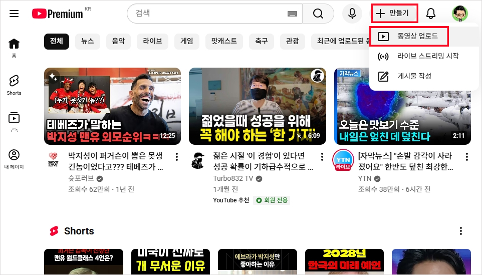 일단 유튜브에 로그인한 후 우측 상단에 [+만들기] 버튼을 클릭한 후 '동영상 업로드'를 클릭합니다.