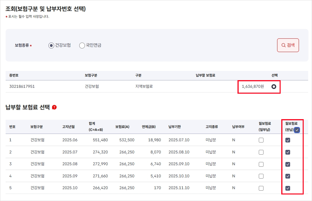 내용을 확인하고 각 월별로 납부할 대상을 체크해줍니다.