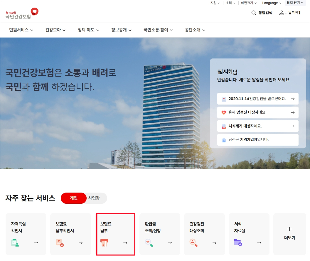 그리고 메인 화면 중앙에 '자주 찾는 서비스'를 보면 중간에 '보험료 납부'라는 메뉴가 보일겁니다. 이걸 클릭해주세요.