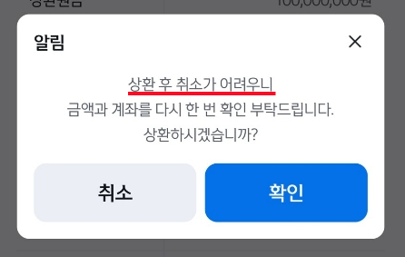 그리고 하단에 상환금액을 입력해주는데 앞서 말씀드렸듯 저는 1억원을 갚을 것이기에 1억원을 기입했습니다.