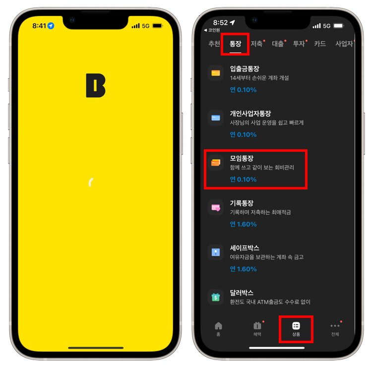 카카오뱅크 앱을 실행하고 하단에 상품 탭을 선택하고 상품 목록에서 '모임통장'을 선택합니다.
