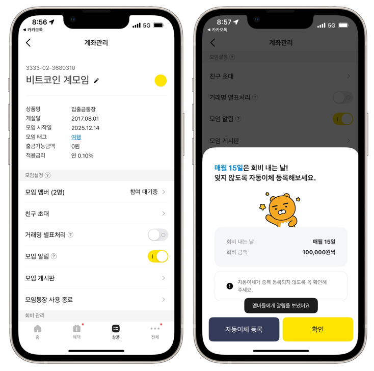 그러면서 자연스레 모임통장이란게 필요했고, 카카오 모임통장을 사용하게 되었습니다.