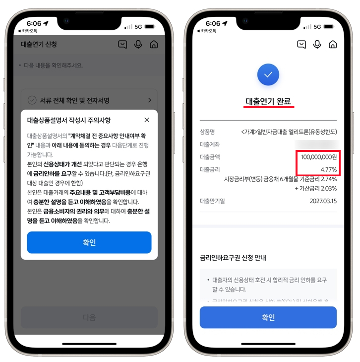 마지막으로 주의사항 확인하면 최종적으로 대출연기가 완료됩니다.
