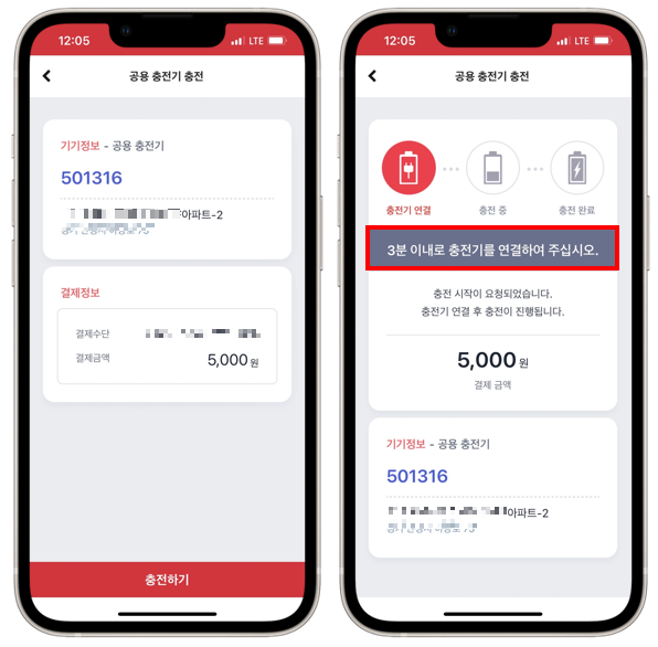 자, 이제 결제가 끝나고 마지막으로 [충전하기] 버튼을 클릭하면 다음 화면에서 "3분 이내로 충전기를 연결하여 주십시오" 라는 메시지가 나옵니다. 그러면 충전기기에 걸려있던 전기선을 차량에 연결합니다.