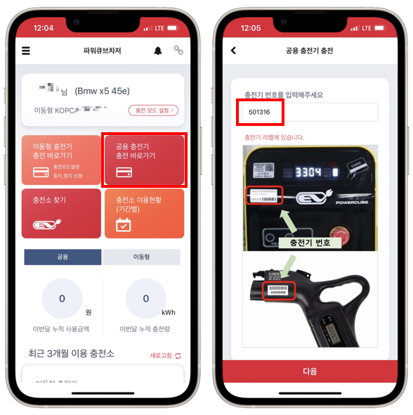 앱을 실행하면 아래와 같이 '공용 충전기 충전 바로가기' 버튼이 있는데 이걸 클릭하고, 다음 화면에서 충전기 번호를 입력합니다. 아까 제가 기억하라고 했던 충전기기 전면에 써있던 충전기번호 여섯자리를 입력해줍니다.